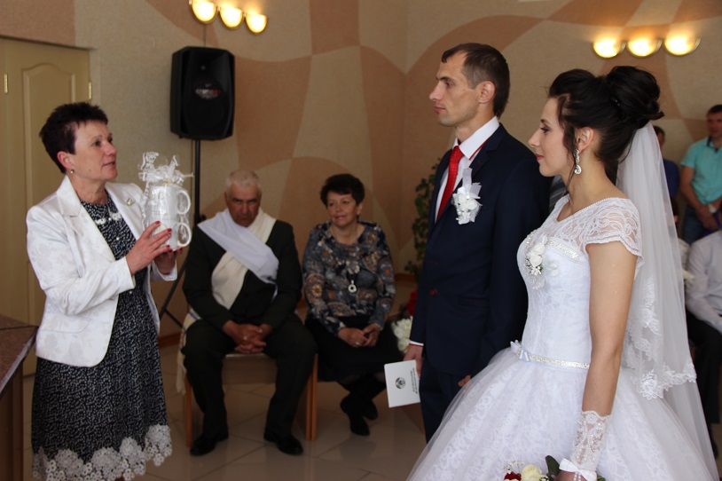 У час рэгістрацыі шлюбу маладых чакаў сюрпрыз. Разам з начальнікам аддзела загса райвыканкама Наталляй Камянчук маладых віншавала старшыня раённай арганізацыі ГА “Беларускі фонд міру” Людміла Бурштын. У падарунак новая беларуская сям'я атрымала  кубкі з лічбай 100.