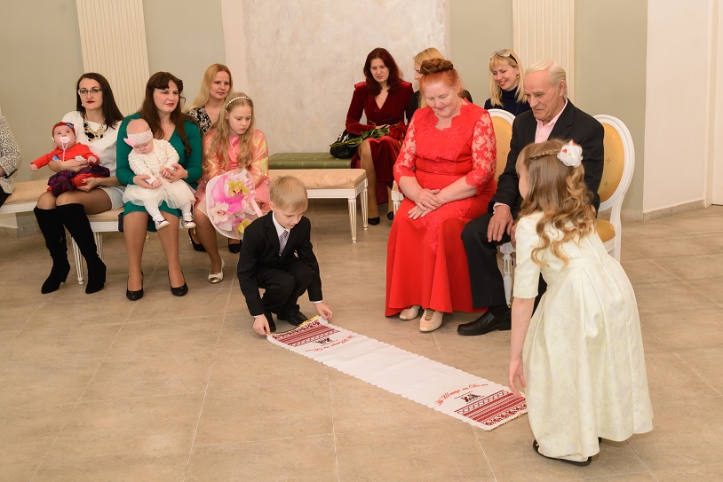 Юбиляры расписались в книге Почетных гостей отдела загса Пинского горисполкома, стали вместе на свадебный рушник, который перед ними растилили внуки Богдан и София, зажгли свечи на свадебном каравае, станцевали золотой юбилейный танец.