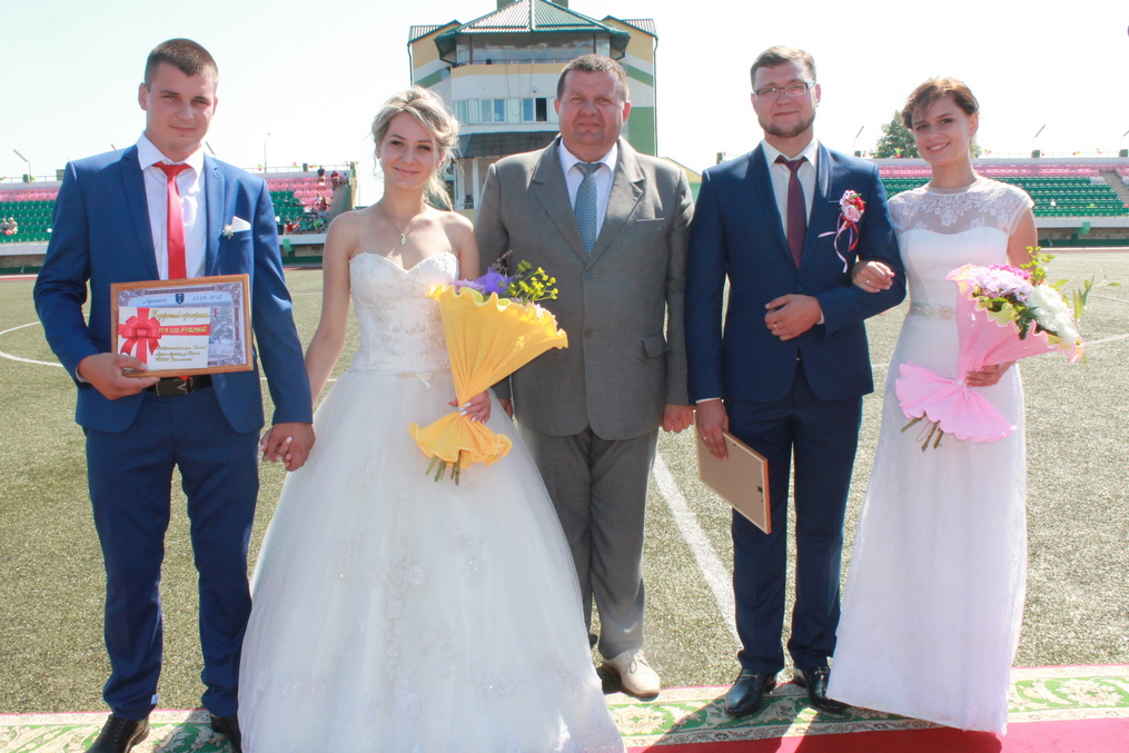 С пожеланиями прожить в любви и согласии не меньше семей Кипцевич и Штейнберг обратились к молодожёнам. Именно они, Дмитриевы Алексей и Алеся, а также Рудько Николай и Алина, зарегистрировали брак в канун праздника города.