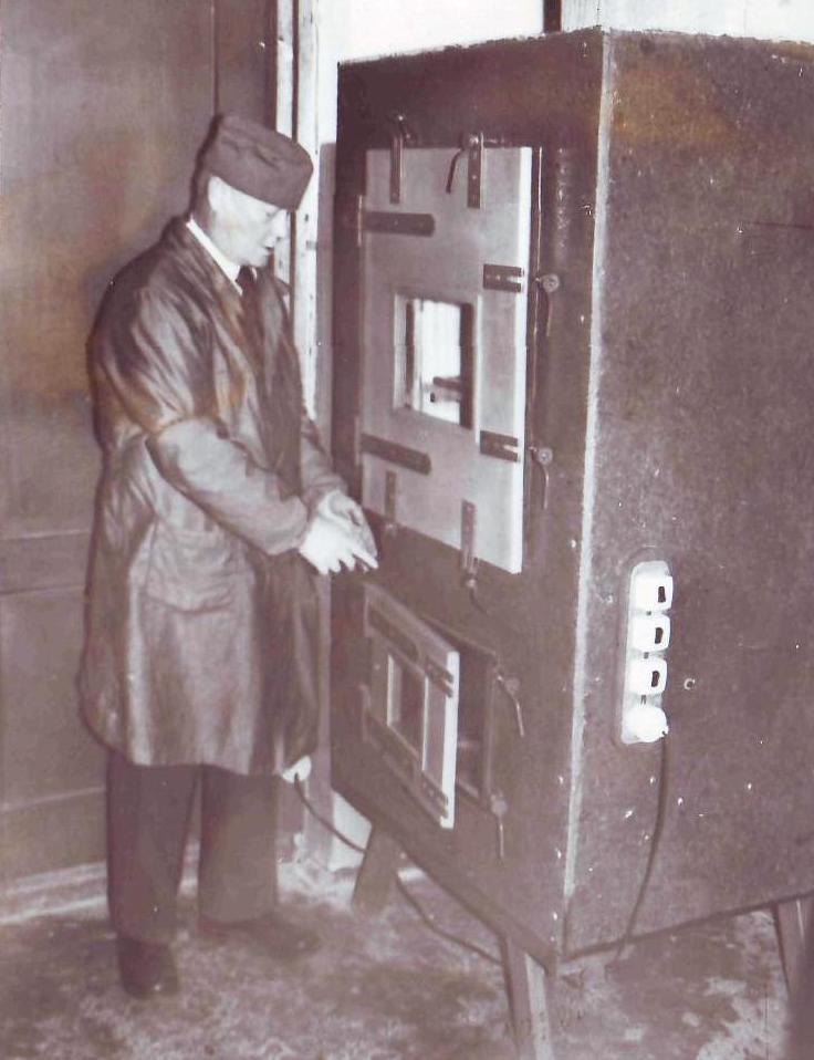 Г.М.Норов во время работы в архиве (у смонтированной им дезинфекционной камеры). 1970-е гг.