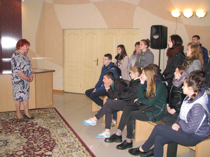 Ребята посмотрели архив загса, в котором находятся записи актов на хранении, регистрационный зал, где проводятся торжественные регистрации. В юбилейный год экскурсия была бы неполной, если бы школьники не ознакомились с историей органов загса. Начальник отдела загса райисполкома Наталия Николаевна Каменчук рассказала ребятам о том, что органам загса 18 декабря 2017 года исполняется 100 лет со дня образования, сделала для юношей и девушек целый экскурс в историю, а также рассказала о задачах и функциях органов загса, ознакомила с административными процедурами, которые осуществляются отделами загса.