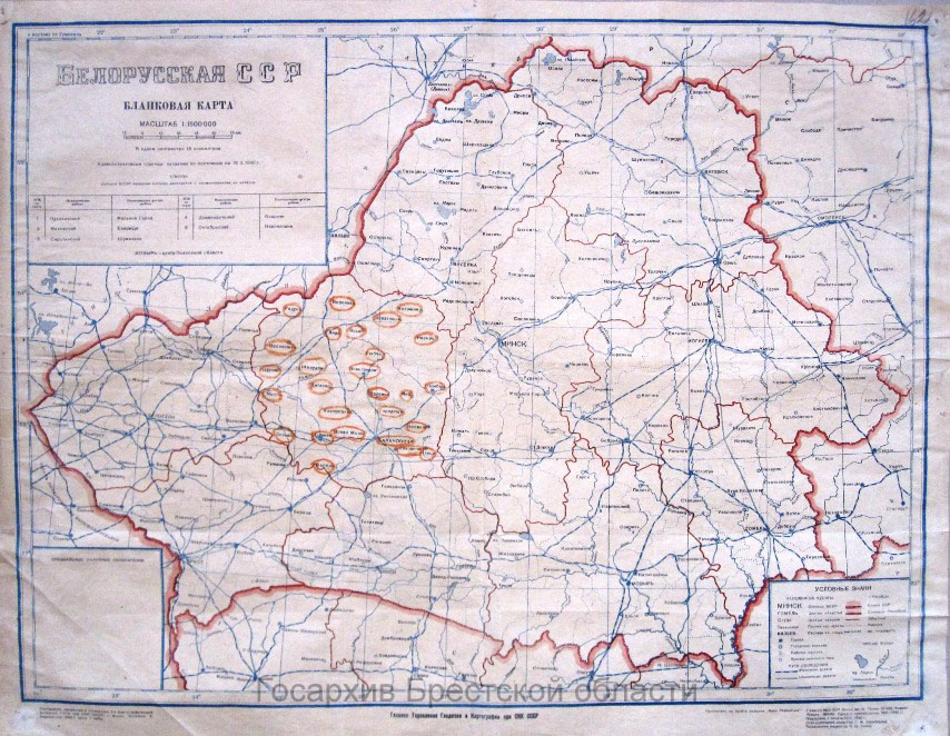 | Карта БССР. 1940 год. (Ф. 7580-П, оп. 1, д. 244, л. 162) | |