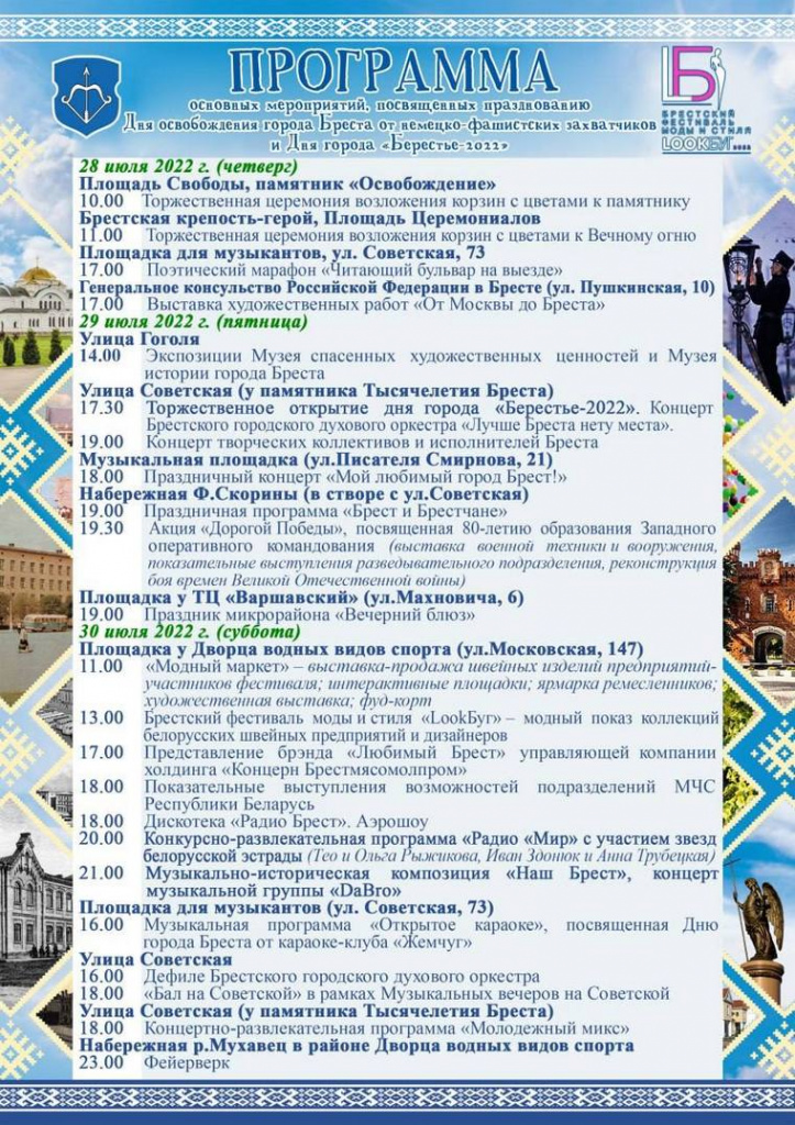 28 июля Брест отмечает 78-ю годовщину со дня освобождения от немецко-фашистских захватчиков. К этой дает приурочено и празднование Дня города «Берестье -2022».