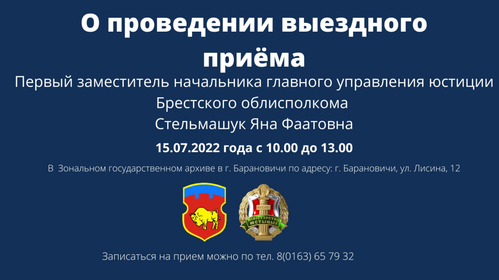 Первым заместителем начальника главного управления юстиции Брестского облисполкома Стельмашук Яной Фаатовной 15.07.2022 с 10.00 до 13.00 будет осуществлен выездной прием граждан в Зональном государственном архиве в г. Барановичи по адресу: г. Барановичи, ул. Лисина, 12, по вопросам, относящимся к компетенции главного управления юстиции. Записаться на прием можно по тел. 8(0163) 65 79 32.