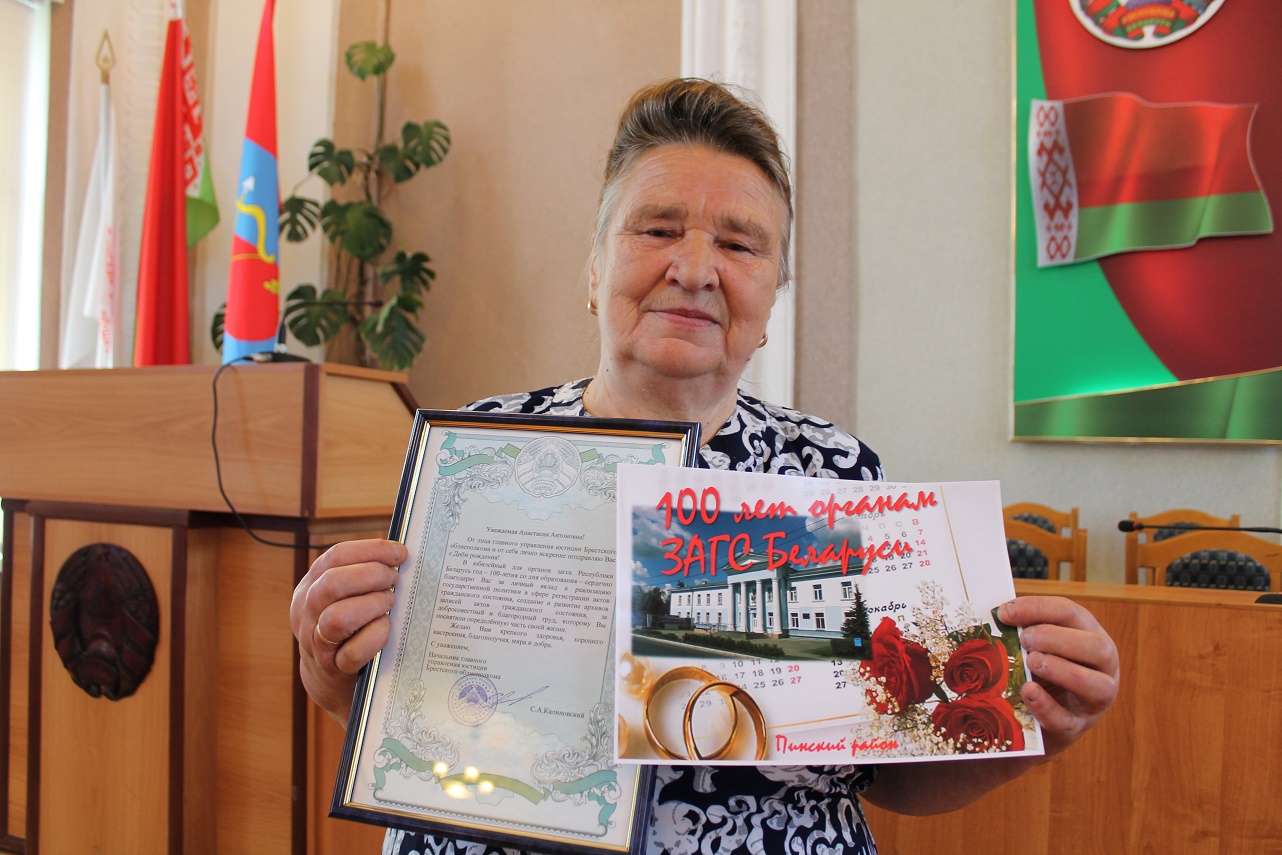 У 1997 годзе Анастасія Антонаўна за паспяховую працу была ўзнагароджана граматай Міністэрства юстыцыі Рэспублікі Беларусь, у 1998 годзе - шаноўнай граматай Пінского райвыканкама. “ЗАГС - гэта любоў усяго майго жыцця”- так пранікнёна і шчыра гаворыць Анастасія Антонаўна.