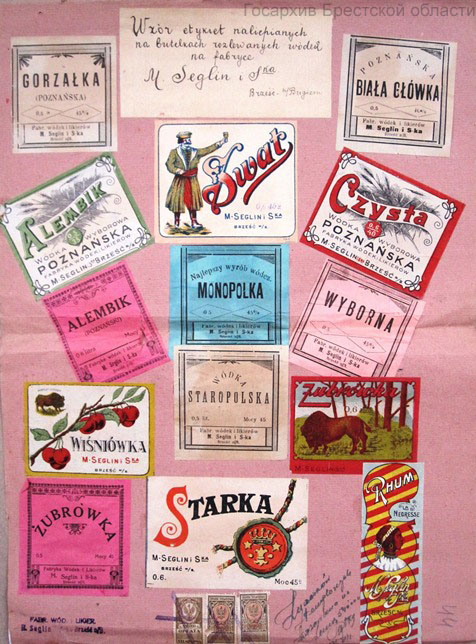 Образцы этикеток вино-водочной продукции, выпускавшейся на Брестском ликеро-водочном заводе владельца М.Сеглина. 1922 год. (Ф. 50, оп. 4, д. 143, л. 44)