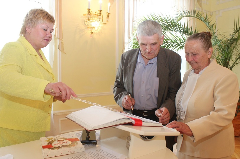 Теплые слова прозвучали от родных и близких, главного специалиста отдела загса Любови Соболь. Начальник отдела загса Марина Левчук вручила памятные подарки и поздравительные адреса юбилярам.