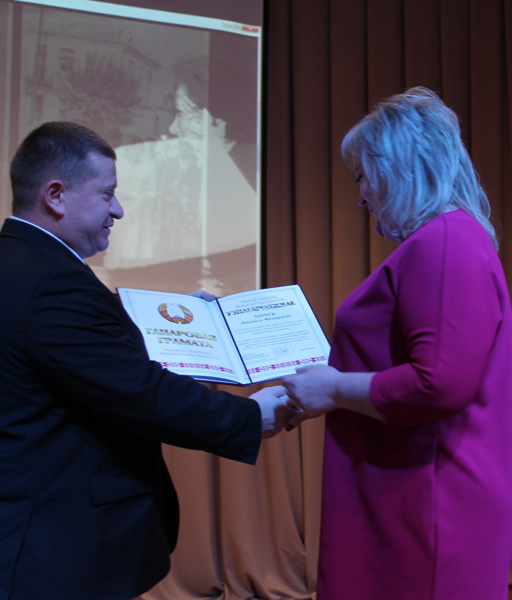 Также Валерий Георгиевич вручил Почетную грамоту Пинского районного Совета депутатов начальнику отдела загса Зенютич А.В., Почетные грамоты Пинского районного исполнительного комитета главному специалисту отдела загса Липчук Л., управляющему делами Поречского сельисполкома Кравчук В.А. Благодарственные письма Пинского райисполкома вручены бывшим сотрудникам отдела загса Линкевич Т.М. и Шоломицкой А.А., управляющими делами Пинковичского и Логишинского сельисполкомов Буриной Н.А. и Петрукович И.В. Благодарностями председателя райисполкома отмечены председатель Ставокского сельисполкома Корень М.Ф., ветераны органов загса – Зубко Вклентина Евгеньевна, Гордич Ирина Сергеевна, Майшук Лидия Алексеевна, Ивашковец Анна Васильевна, Кришталь Валентина Петровна, Лебедевская Мария Фёдоровна, Жогальская Раиса Герасимовна, Шпаковская Ева Васильевна, бывшие секретари сельских Советов, отработавшие в органах государственной власти более 20 лет.