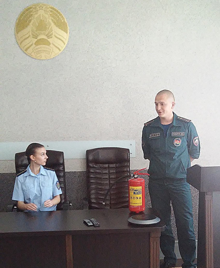 Инспектором Каменецкого РОЧС были разъяснены правила пользования пожарным огнетушителем, а также было наглядно показано его использование на практике. Сотрудникам отдела принудительного исполнения Каменецкого района были повторно разъяснены правила пожарной эвакуации в случае возникновения пожара.